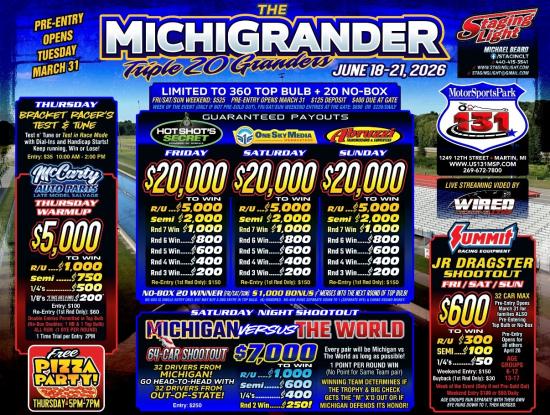 June 18 – 21 Thursday – Sunday Michigrander Junior Dragster Entry US 131 Motorsports Park Jr. Dragster $150 Weekend Entry, 29 LIMITED entries. *Pre entry at this time are for racers that are also purchasing Big Car entries. Crew passes can be purchased at the gate upon arrival. Jun 18 – 21 Michigrander Junior Dragster Entry US 131 Motorsports Park Purchase Tickets Pricing Information Driver $150.00 Jr. Dragster Weekend Entry Location US 131 Motorsports Park 1249 12th St. Martin MI 49070 Jr. Dragster $150 Weekend Entry, 29 LIMITED entries. *Pre entry at this time are for racers that are also purchasing Big Car entries. Crew passes can be purchased at the gate upon arrival. Driver Information Jr. Dragster $150 Weekend Entry, 29 LIMITED entries. *Pre entry at this time are for racers that are also purchasing Big Car entries. Crew passes can be purchased at the gate upon arrival. Back Please select the type of admission you would like to purchase Michigrander Junior Dragster Entry - Driver Purchase Tickets Jr. Dragster $150 Weekend Entry, 29 LIMITED entries. *Pre entry at this time are for racers that are also purchasing Big Car entries. Crew passes can be purchased at the gate upon arrival. Michigrander Junior Dragster Entry Please enter the password to access this event Incorrect password. Please try again. SUMMIT26 Submit